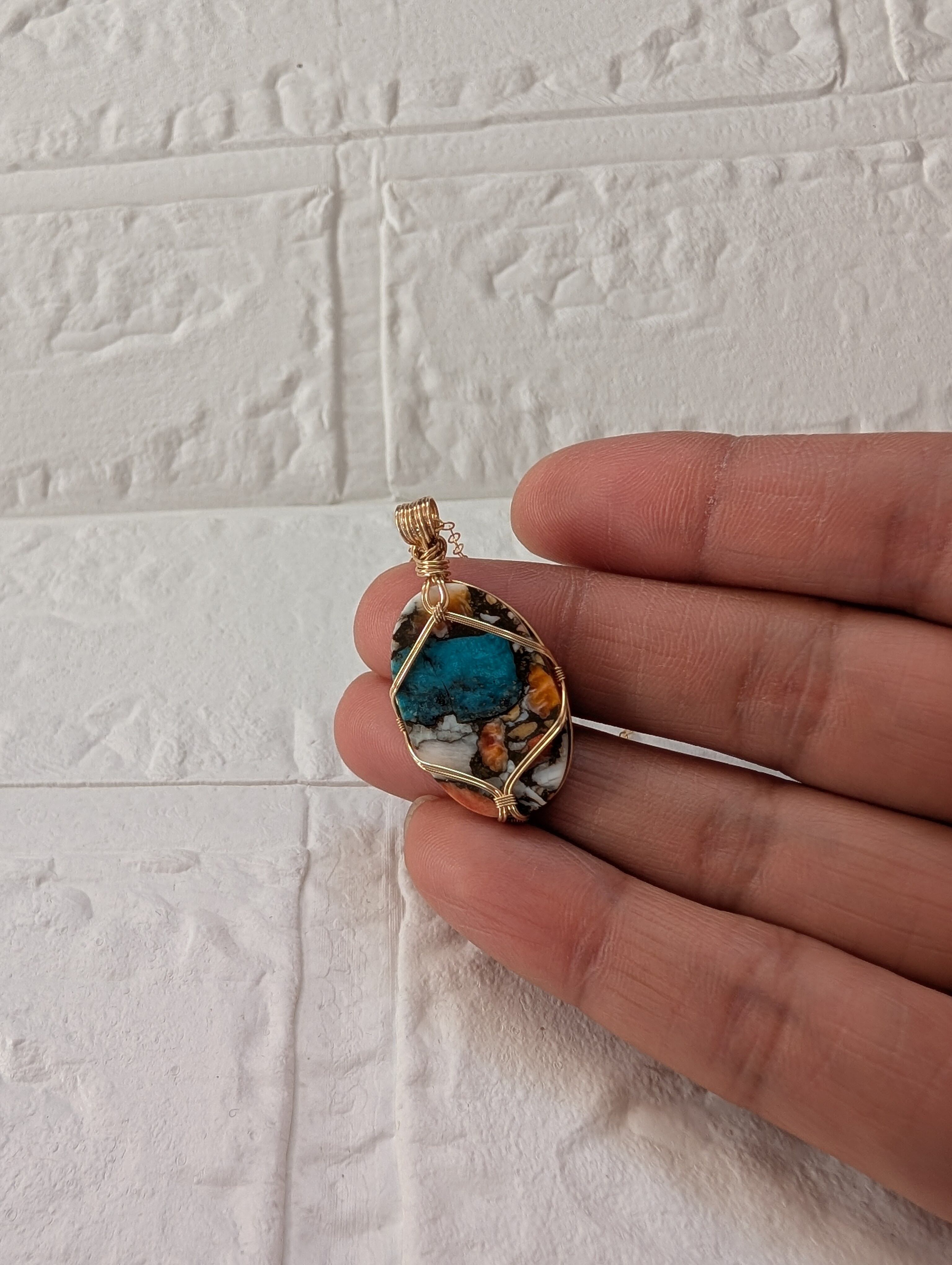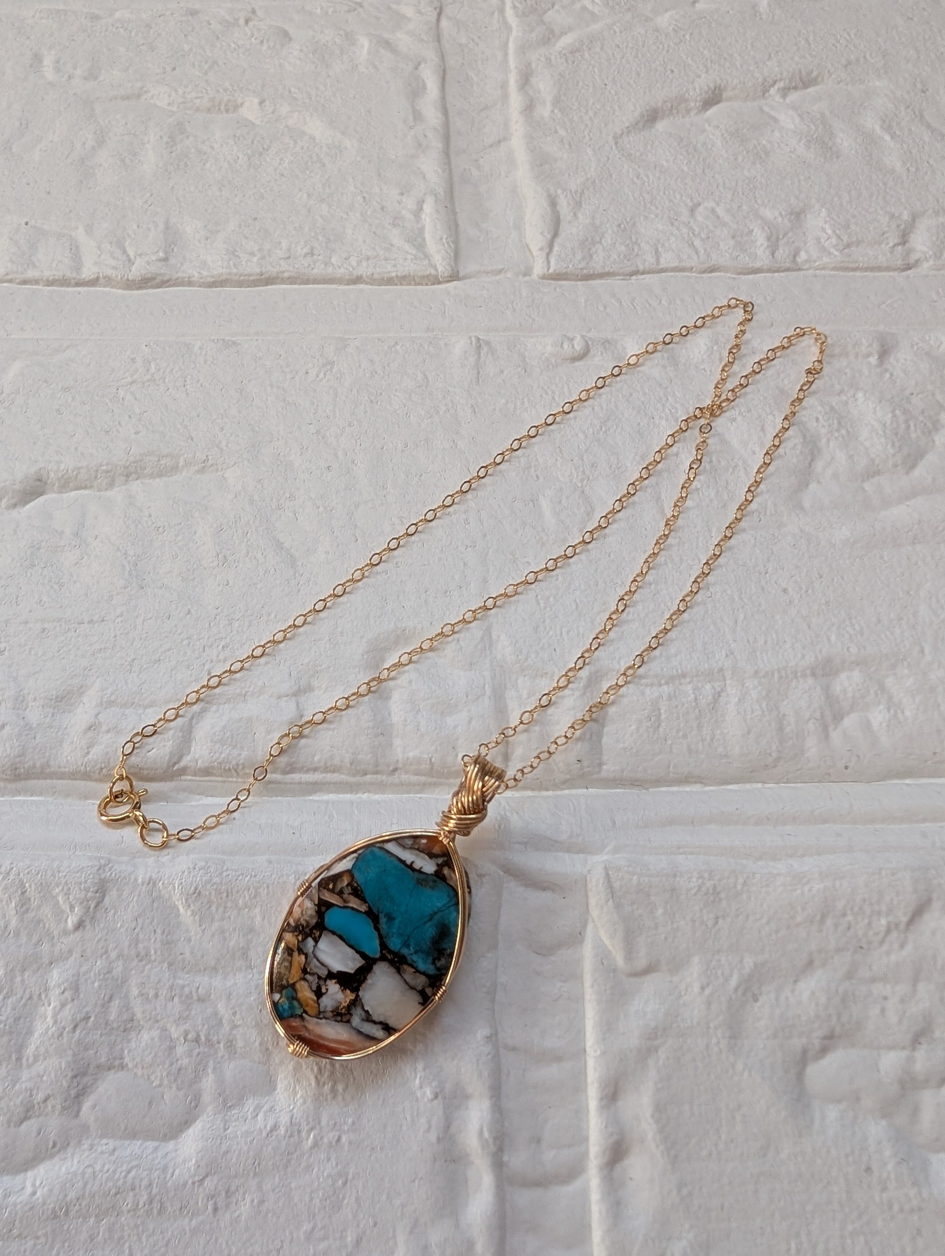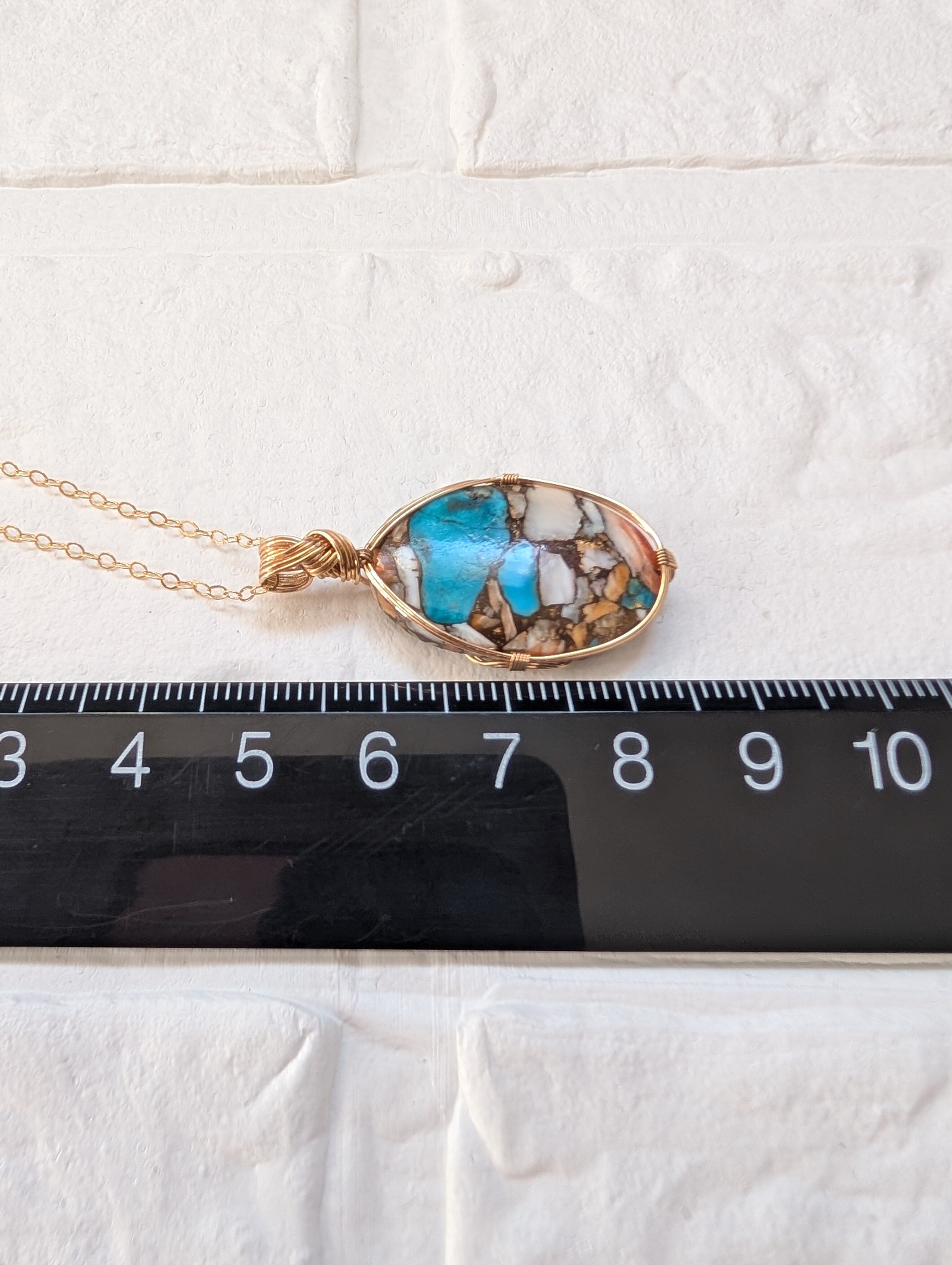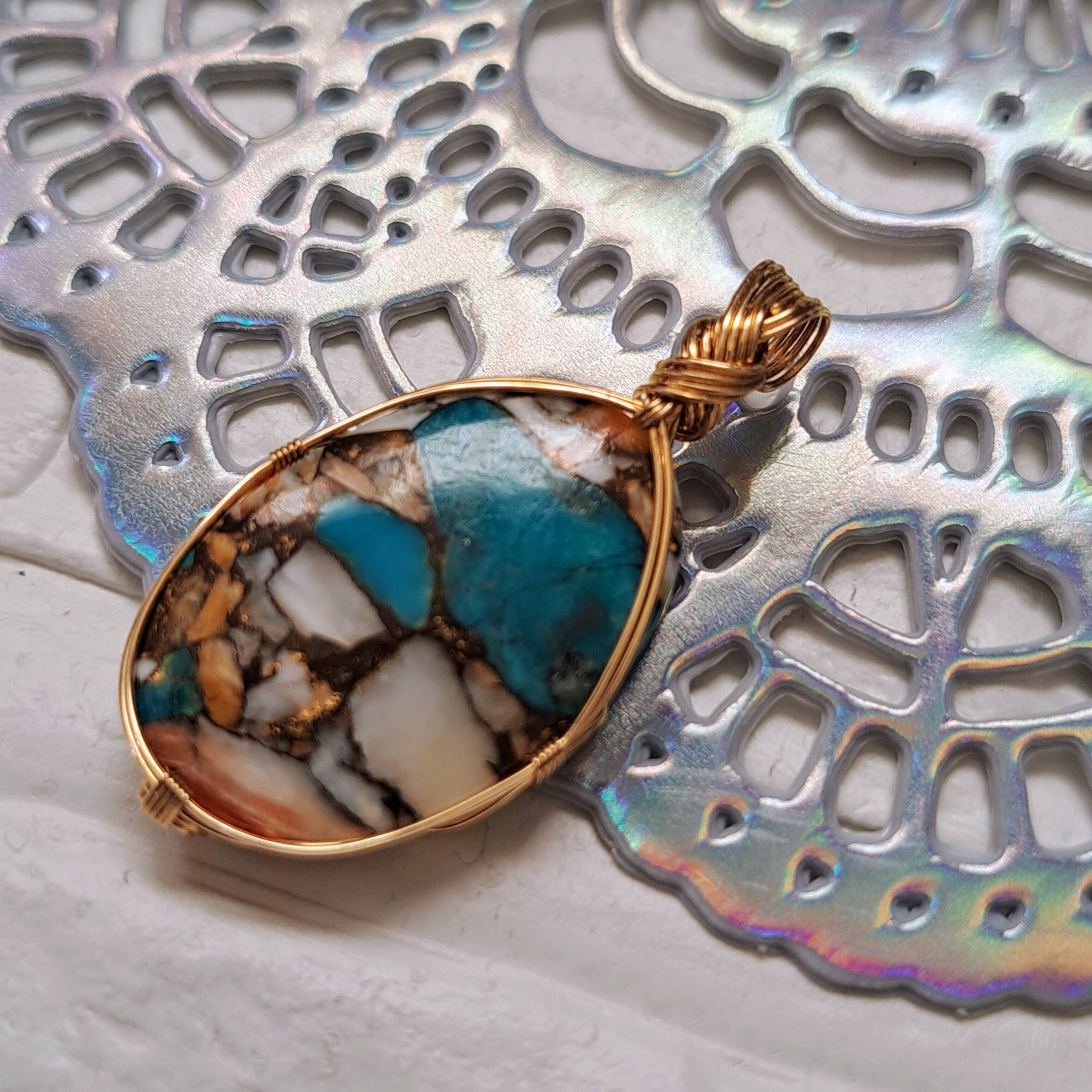 オイスター(貝殻)とコッパー(銅)とターコイズを混ぜ合わせた練石であるオイスターカッパーターコイズを女神巻き®で仕上げました。
