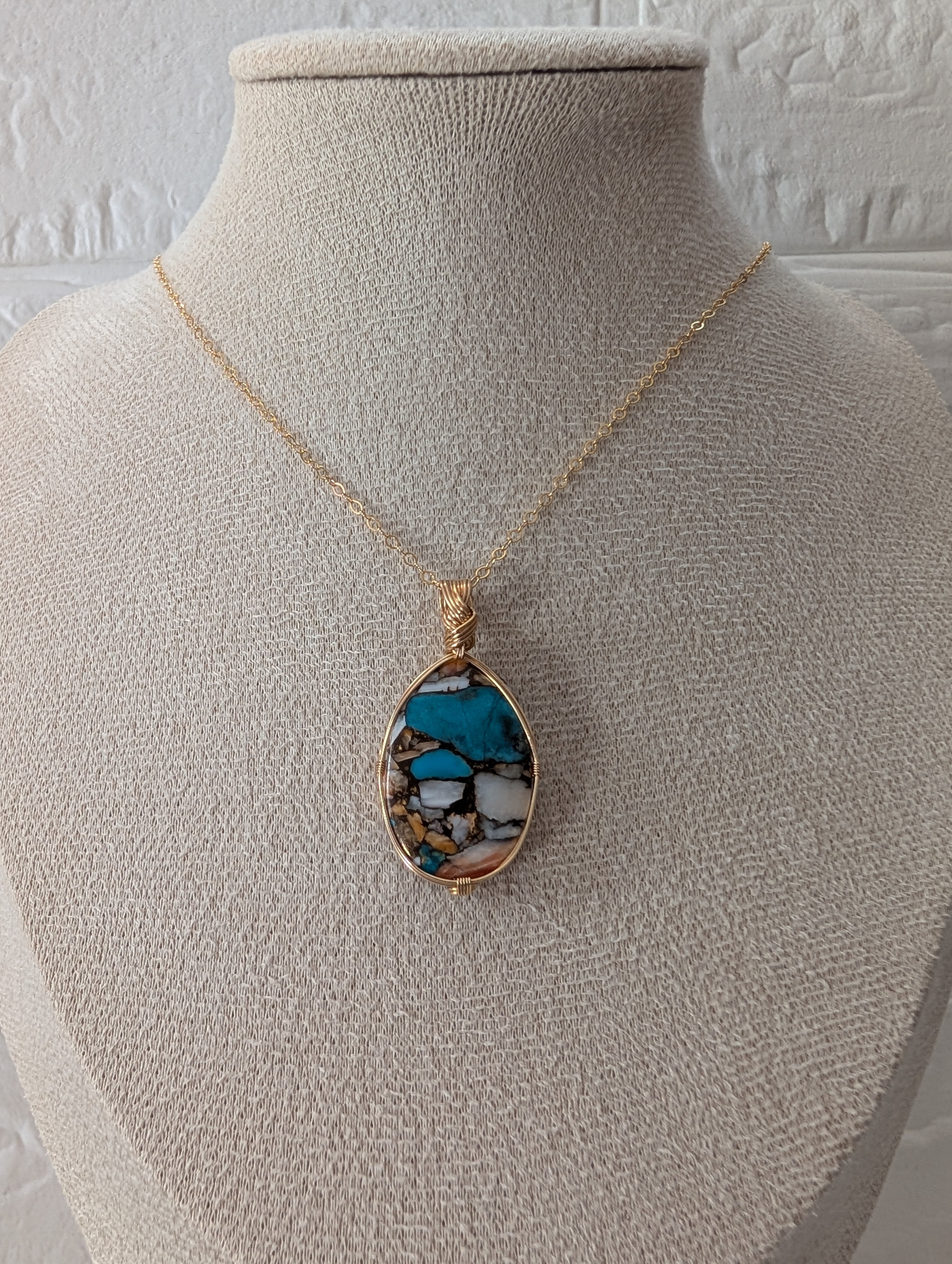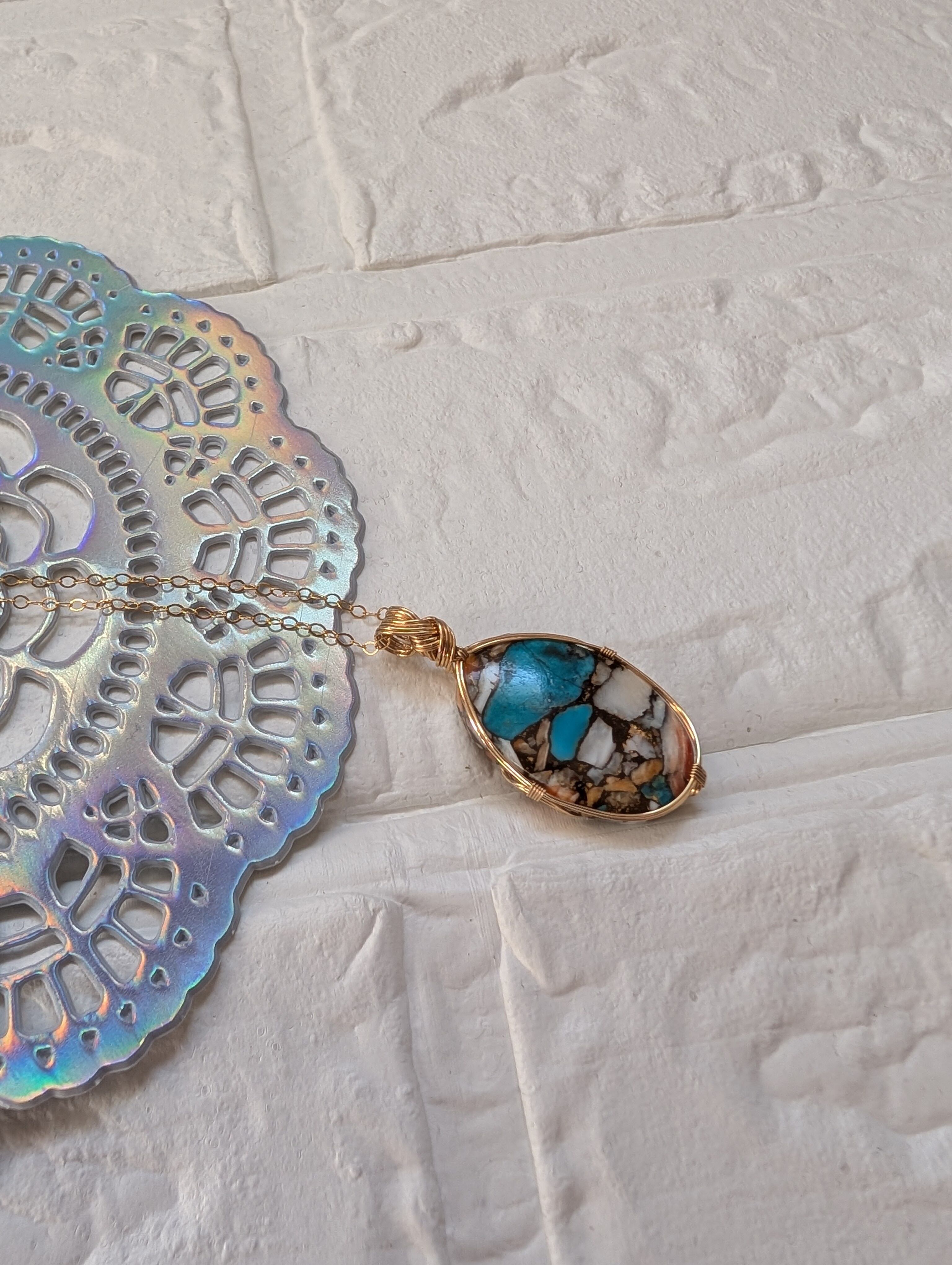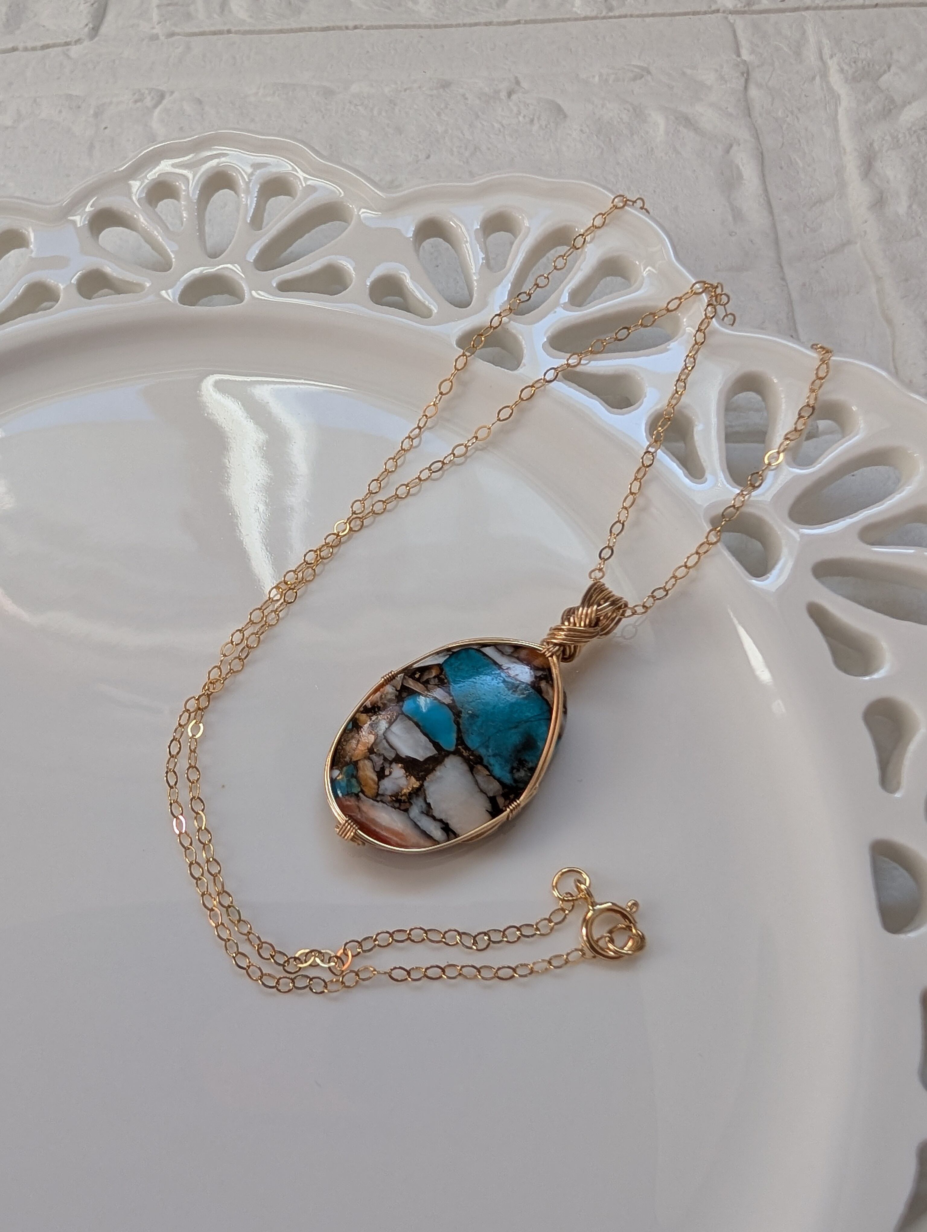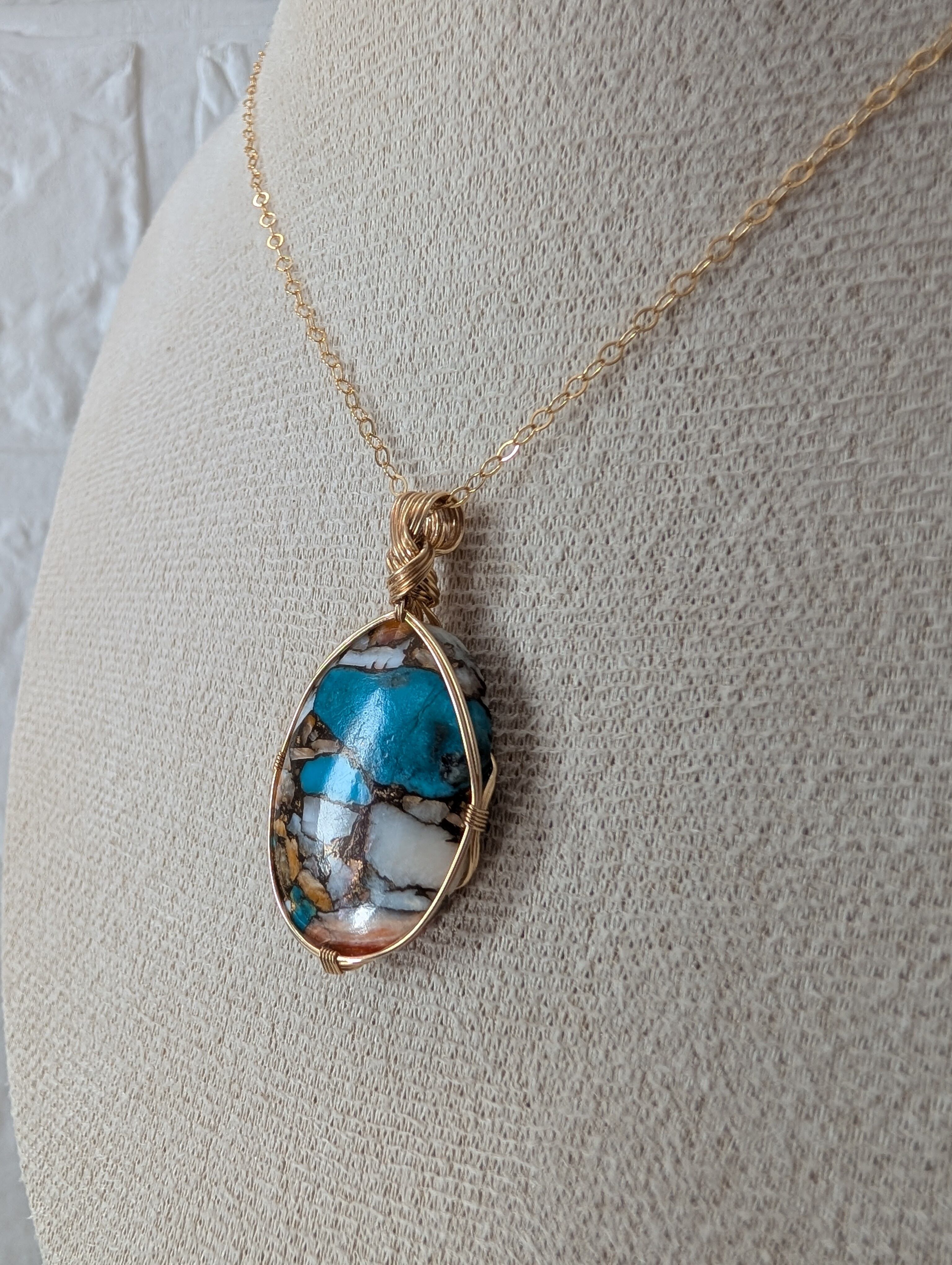 オイスター(貝殻)とコッパー(銅)とターコイズを混ぜ合わせた練石であるオイスターカッパーターコイズを女神巻き®で仕上げました。