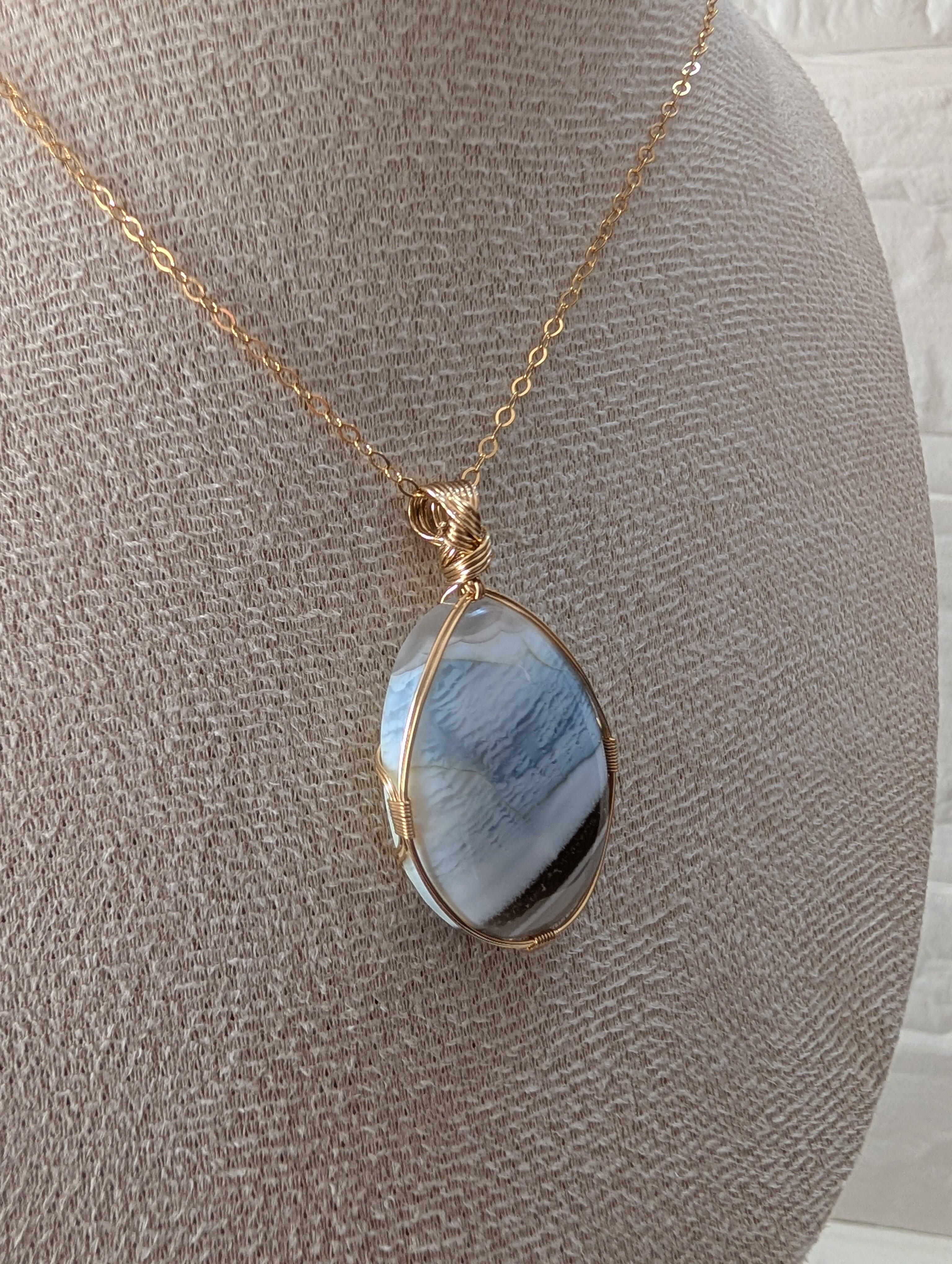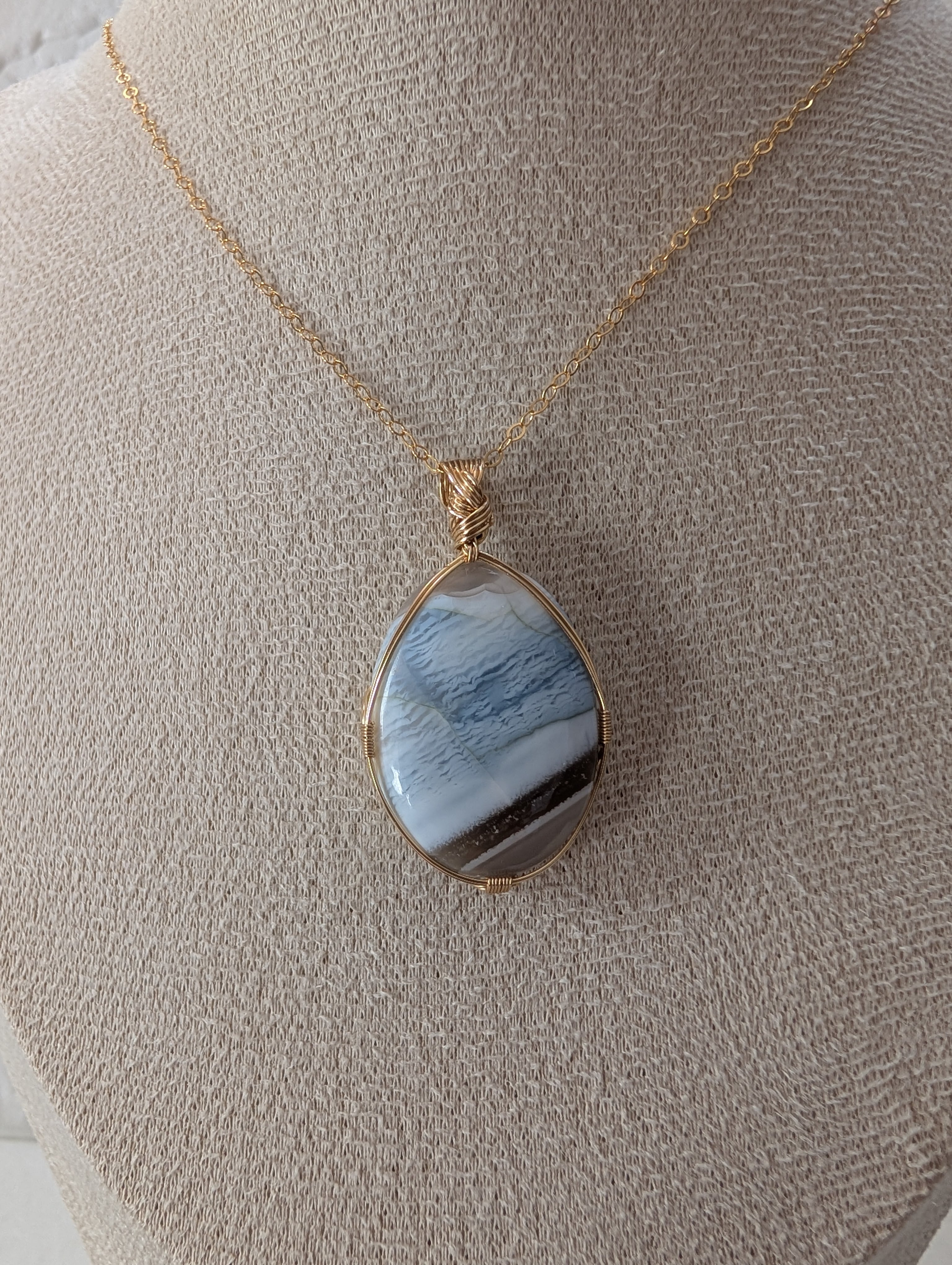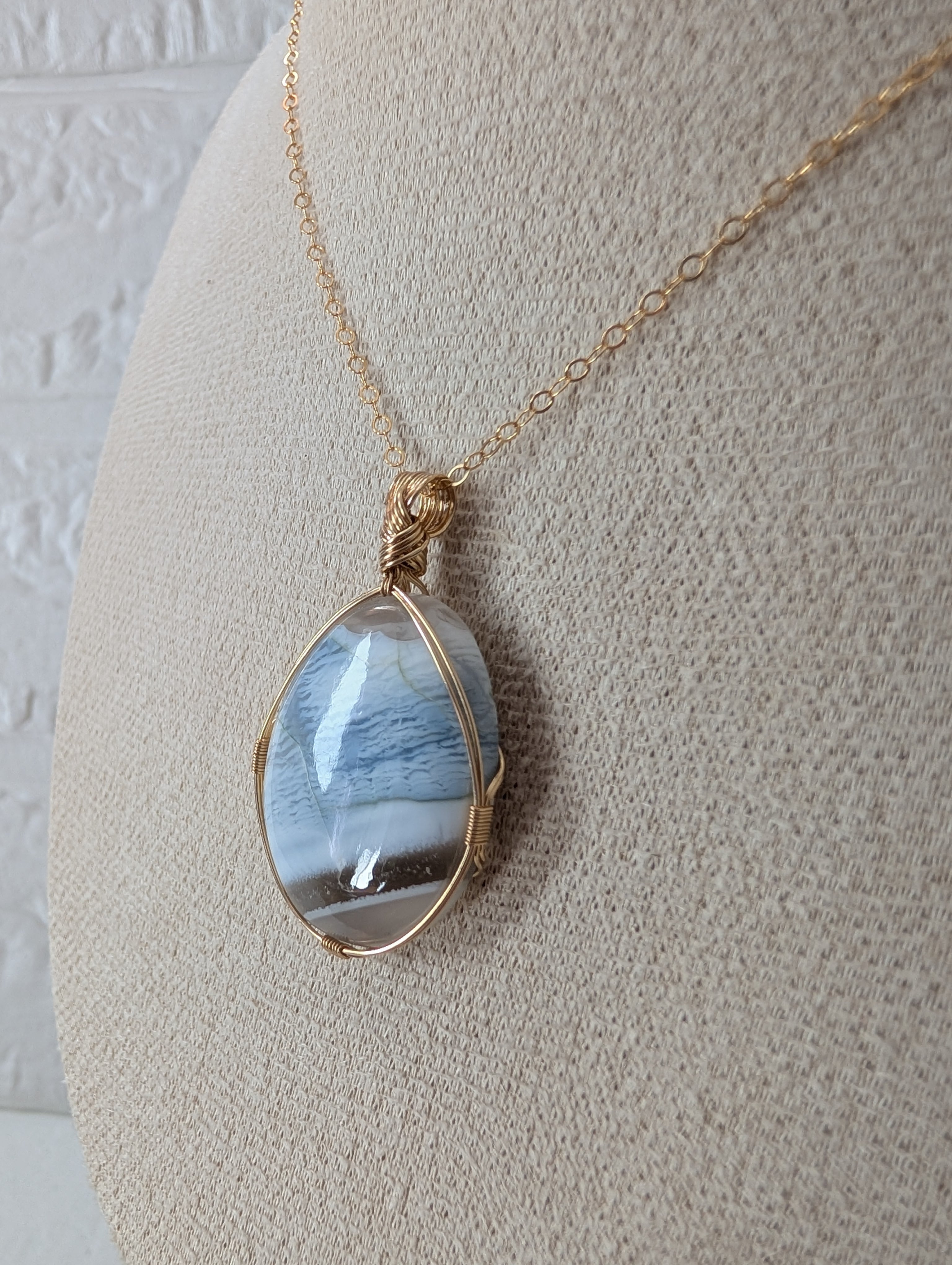 心地よい穏やかな静けさを感じさせるブルーオパールを女神巻き®で仕上げました。