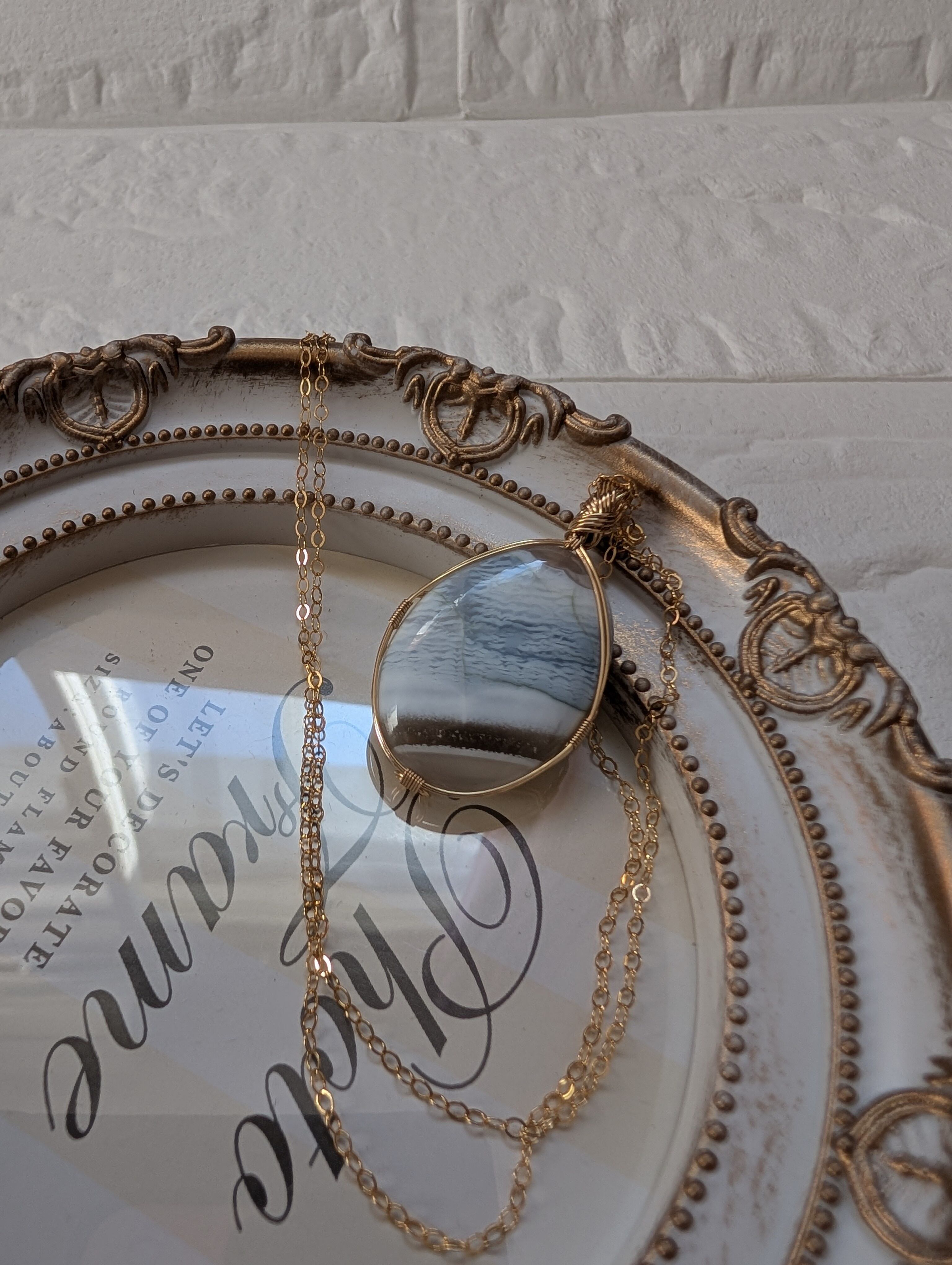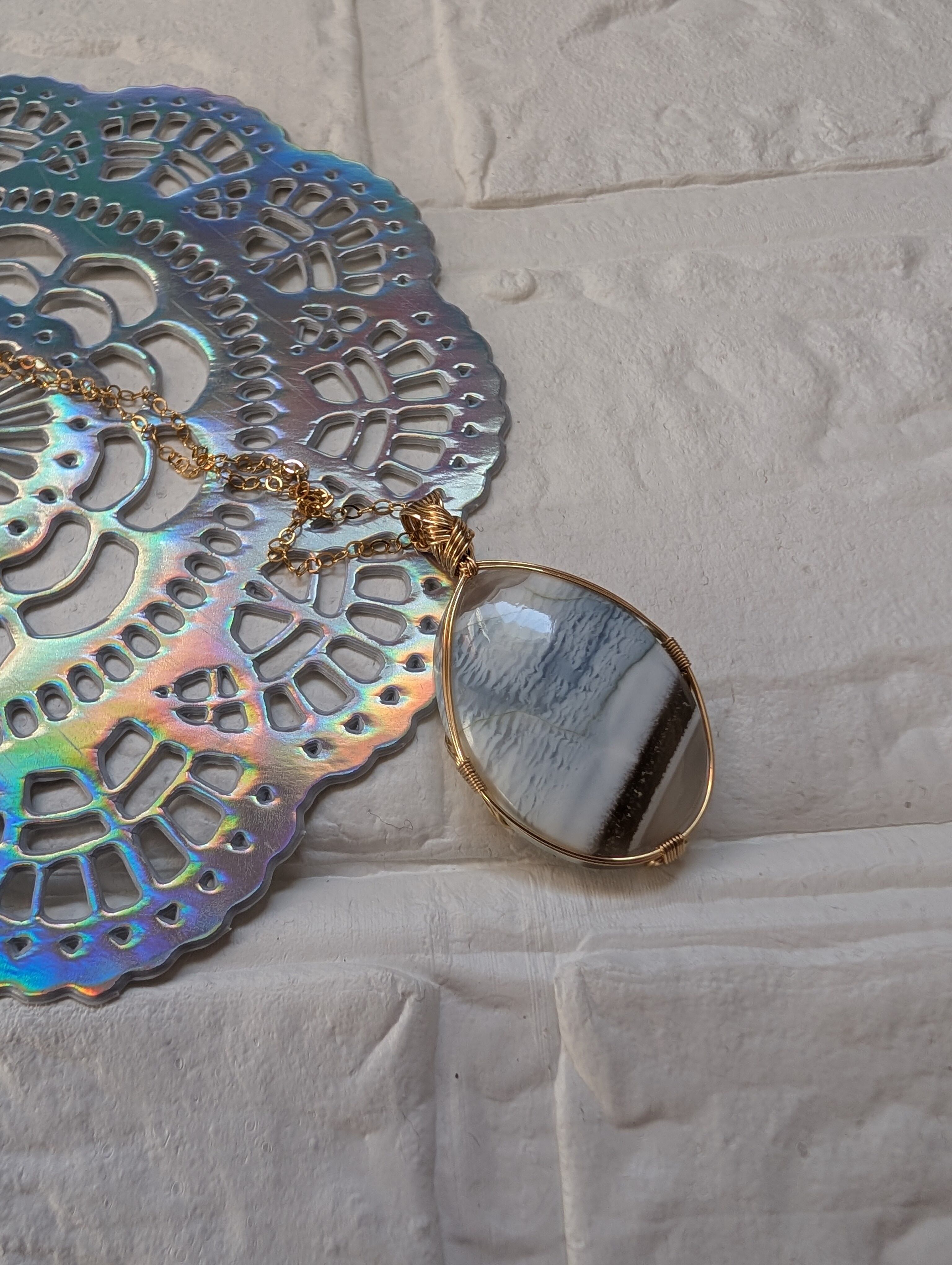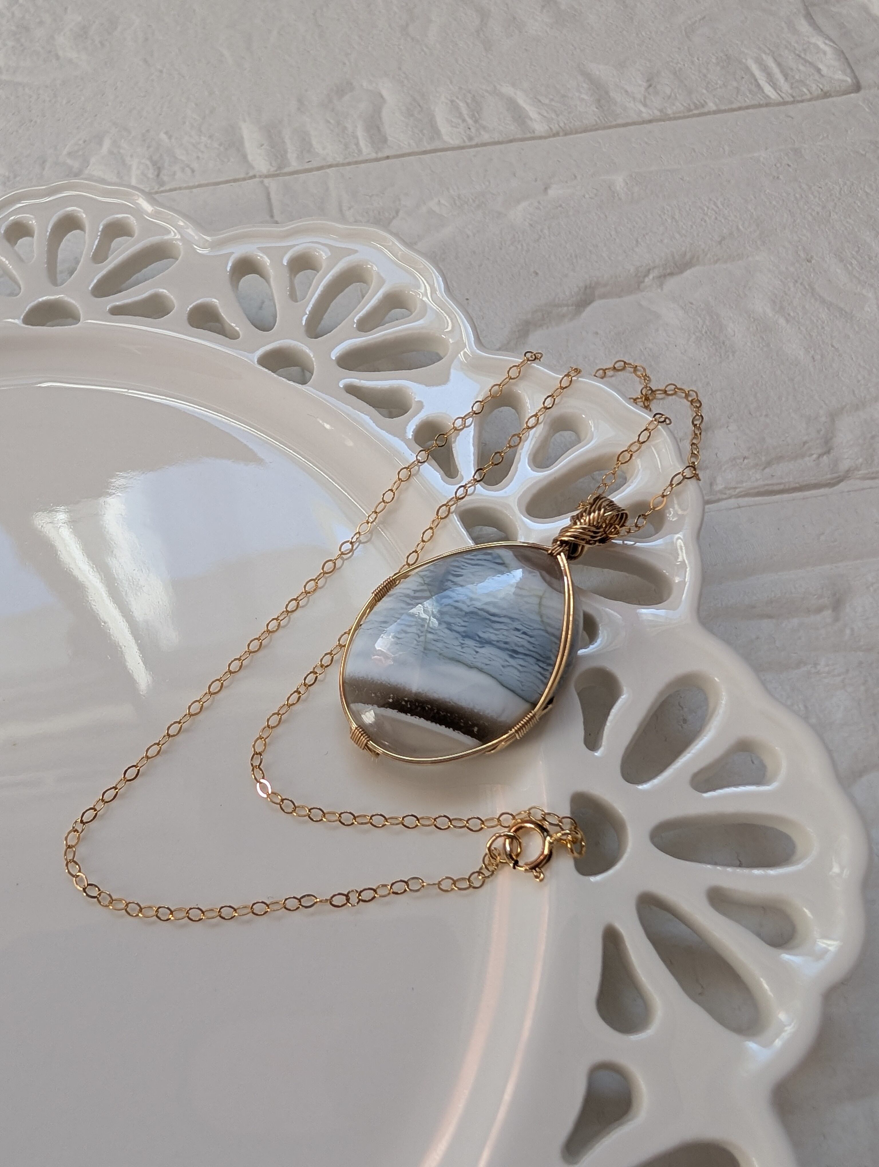 心地よい穏やかな静けさを感じさせるブルーオパールを女神巻き®で仕上げました。